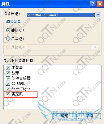 如果存在该项,则勾选上这一项。如果该项没有,则说明声卡不支持麦克风和耳机直连。点击“确定”,音量控制面板会变成如下:
