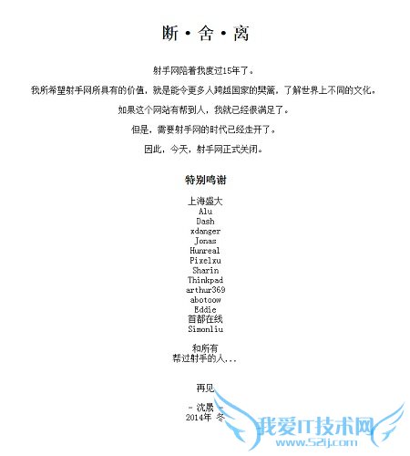 同日,以电影中文字幕为主的主题资讯交换平台射手网宣布关闭,站长沈晟发表了名为“断·舍·离”的文章,宣布射手网正式关闭:射手网陪着我度过15年了。我所希望射手网所具有的价值,就是能令更多人跨越国家的樊篱,了解世界上不同的文化。如果这个网站有帮到人,我就已经很满足了。但是,需要射手网的时代已经走开了。因此,今天,射手网正式关闭。