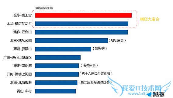 春节期间民众的游览诉求常与庙会、祈福结合。高德地图数据分析团队通过位置大数据分析历年春节期间主要景点的游客涨幅变化,预计今年游客涨幅最大的景区,大部分都与其举行庙会有关。例如,今年春节期间游客涨幅最高的top10景区依次为金华秦王宫、梦幻谷、云台山、北京地坛公园、罗浮山、莲花山旅游区、衡阳南岳庙、开封清明上河园、北海银滩和黄山宏村(图6)。其中,排名前两位的秦王宫和梦幻谷主要是有横店大庙会,而北京的地坛公园则有地坛庙会,衡阳南岳庙有南岳庙会。