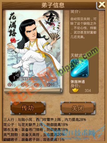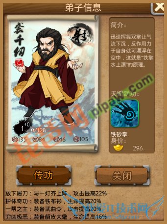 郭巨侠的属性成长也是相当不错的,比较平衡的成长属性,适合防守反击型的弟子。但是其缘份比较难开启,几乎全是甲级缘,对非R来说也是比较大的硬伤。天赋武功甲级群攻降龙十八掌也是奠定了是后期型弟子的基础。