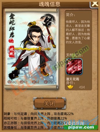 三大开局弟子中平衡性的弟子,攻防血内兼备。但由于是平衡型弟子培养方向也不是非常明确,实际使用中效果一般。6个缘中四个弟子缘也是对攻防血内四个属性的加成。金蛇剑和贪狼令非R们就需要多花些时间等待了。天赋武功漫天花雨的触发几率也一般。平衡型弟子往差了说就是没什么特点哇。
