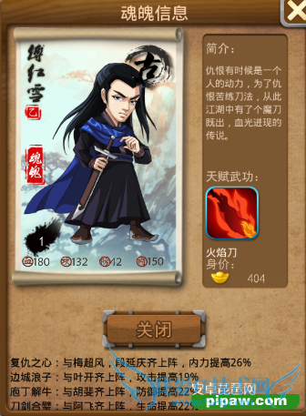 阿飞的总体属性虽然不算优秀,但是他的攻击成长和血量成长都是名列前茅的,因此无论是在江湖论剑还是血战上都算是比较好用的弟子。尤其是在前中期的表现绝对是亮点。自带的丙级增加攻击的降龙伏虎功,也是非常不错的。省去了刷一本武功的时间。再来看下他的缘份,选傅红雪作为开局的弟子想必得到阿飞都会开心半天吧。独孤九剑的缘还是很给力的!贪狼令缘份虽好,但不是那么容易实现的。闭关属性为命中,感觉不怎么好呀。不过从他的综合使用性来判定在前期是一名非常给力的弟子。