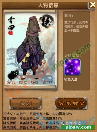 说到李四就必须说到张三,这两个与阿飞、荆无命一样,两个在一起才最好。李四的攻击成长高于张三,所以可以说张三是为了配合李四而出现,两人在一起的攻击加成配上降龙伏虎功可以至少提升攻击33%。其他两个缘对于非R来说比较废。天赋武功是群体攻击吸星大法,效果还算不错。可惜闭关效果是破招,张三是格挡。