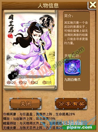 和另外两名开局弟子一样,周芷若的属性成长是在所有乙级弟子中排名前十的,主要是内力成长。她能排前面更主要的是她的天赋武功,九阴白骨爪的触发几率相当之高,适当增加下她的攻击,只要触发武功,那么就稳了。再加上她闭关之后是暴击属性,又增加了不少战斗力。再看下她的缘份,与灭绝师太的缘,容易实现。曾经有一次开局,万里挑完后,直接就出了灭绝师太。而与赵敏的增加攻击的缘,只要是上次参与了闯江湖送美女魂魄活动的掌门应该不缺赵敏了。不过剩下的倚天剑、九阴真经还有巾帼英豪的缘份就不是那么好开启了。