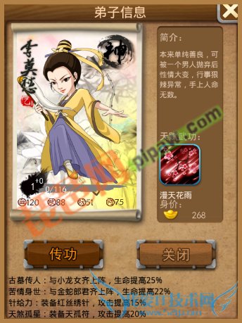 就总体属性来说也是甲级弟子当中属性成长的前十名。天赋武功鹰爪手比较一般。从缘份来说,杨过、独孤求败和朱雀簪都不是那么容易实现的,所以实用性较差。只能凭借其自身的属性优势了(血成长较高)。