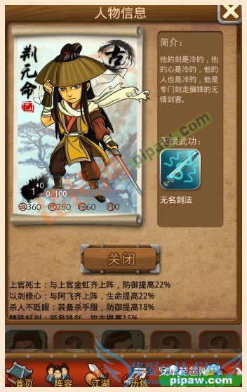 荆无命在前期绝对是变态的存在,初始280的攻击已经超越了甲级弟子,而且他的攻击成长也是最高的。有了荆无命在前面的一些关卡几乎可以一路碾压,要卡2星的朋友要小心了,荆无命一刀就会带走对手的哦。因其高攻击的菜刀特点在卡5人血战的时候是一个非常好用的弟子,甚至超越甲级弟子。不过他的其他方面就表现较弱,比如除了攻击属性,其他成长都不怎么样,天赋武功丁级无名剑法也没有升级的必要了,因为他的内力成长为零。荆无命的闭关也是命中。而缘份上来看,他也只能作为帮别人配缘的存在了。杀手服和铁剑注定了他作为前期明星的路线。