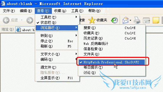 从IE的“查看”—“浏览器栏”—“HttpWatch”启动HttpWatch。如下图所示: