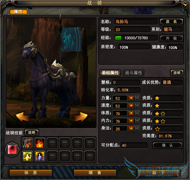 (10)法强资质:法强资质越高,战骑法术强度越大。