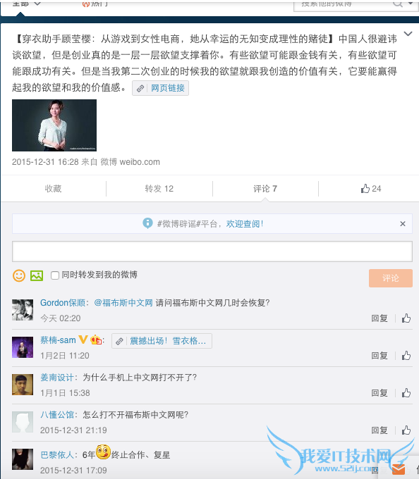 百度搜索福布斯中文网进入,所有指向该网站的文章和链接均无法显示,其微博更新也停留在12月31日,不过从评论区看来,网站关闭时间或许也是在31号。