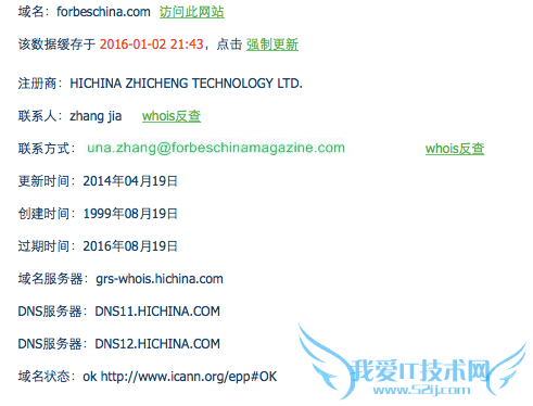 随后我们又对www.forbeschina.com的域名进行了查询,我爱IT技术网的查询页面显示,该域名于2016年08月19日到期,但在1月2号停止缓存。