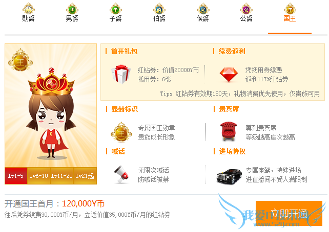 贵族的等级森严,从最低的勋爵到伯爵、公爵,价格也水涨船高。开通最高级的国王首月需要支付12万人民币,随后每月支付3万。这样换来的利益是:特殊的贵族形象和勋章、直播间里的贵族席位、无限次的喊话机会和进场专属座驾。贵族的喊话有专门的显示区域,不过高段位的贵族可以直接禁掉比自己级别低贵族的发言,国王可以禁所有人。