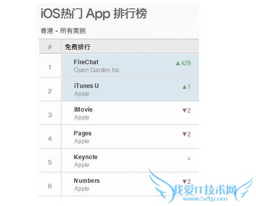 如果你也是在监控App Store榜单的开发者,你一定注意到了今天一个不寻常的大变动:一款名为「FireChat」的社交App,排名暴涨429位,冲到了香港区免费榜的第一名。排在它后面的,依次是苹果自家的iTunes U、iMovie、Pages、Keynotes等办公及娱乐套件。