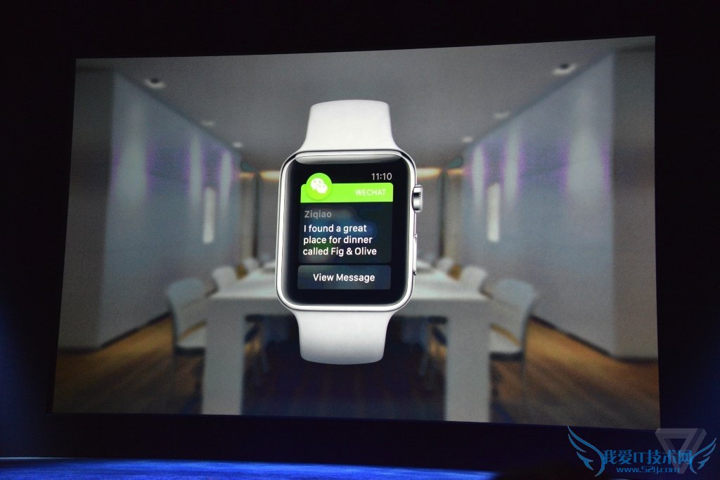 苹果技术副总裁Kevin Lynch现场演示了通过Apple Watch使用微信,可以直接回复表情等。