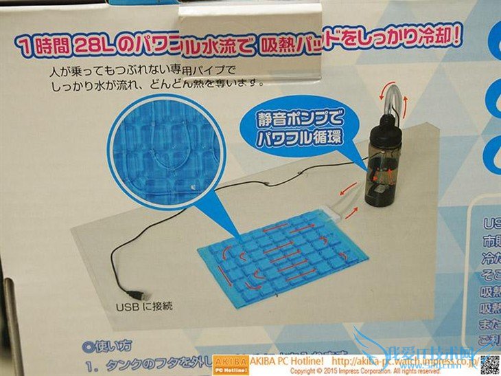 消息的来源是PC Watch,这个水冷垫并不是单纯密封的水垫,而是有循环水道的,水泵使用USB供电驱动,使用方法与普通的散热垫一样,直接放在笔记本下面就可以了,垫子尺寸是300*200*18mm,使用的材料相当的耐压,即使是把散热垫放在椅子上,50kg的人坐上去也不会破,水泵工作时的噪音只有10dB,相当安静。
