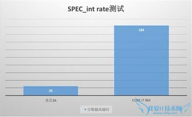接着是多线程测试SPEC_int rate。计算所只提供了四核心版本的龙芯3A的多核测试分数,我们找到了一款老版四核i7 965 3.2G的成绩来做比较。