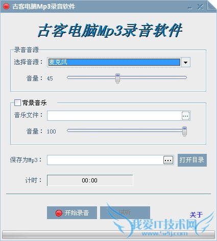 完全免费的录音软件,无录音时间限制,自动保存为Mp3文件,无需再次压缩,可调节录音音量,如麦克风话筒音量等,支持同时录制背景音乐,用它来录制自己的卡拉OK、翻唱歌曲非常方便!