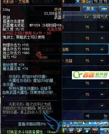 等级75史诗短剑,物理攻击力+715,魔法攻击力+849,独立攻击力+460,智力+52,施放速度+2%,魔法暴击率+7%,攻击时附加15%的伤害,光属性攻击时,增加25%的暴击伤害,受到光属性攻击时,会赋予自身武器光属性,效果持续120秒。