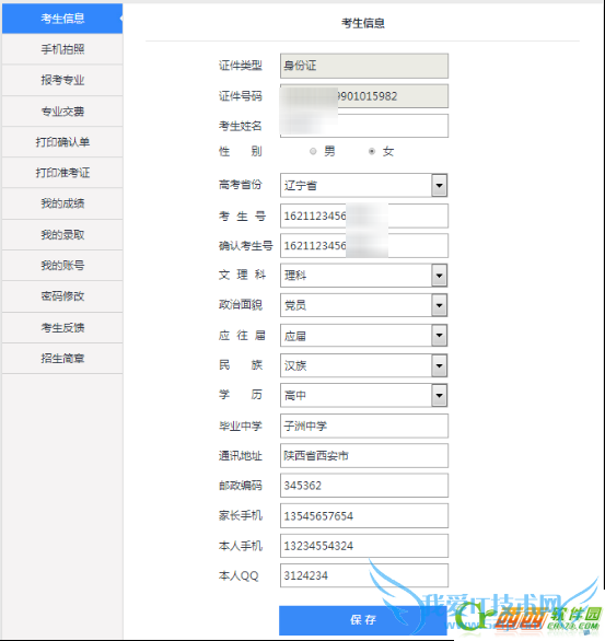 登录后,考生填写基本信息,填写完毕后保存信息(如图3-1),考生基本信息提交以后不允许再次修改,提交前请仔细核对