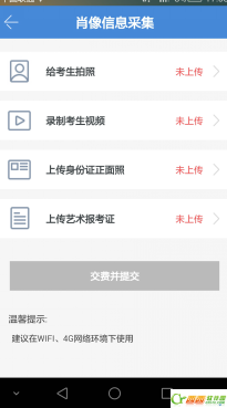 在线确认报名的考生可以在手机上完成肖像信息采集,具体采集信息包括:拍摄免冠一寸照、拍摄5秒语音视频、上传身份证正面照、上传艺术联考证,肖像采集过程建议在WiFi或者4G网络下完成。如下图