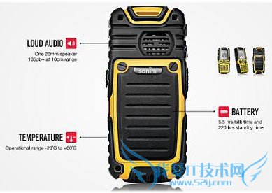 性能配方面,Sonim XP3支持三重频带GSM网络制式,并且标配的容量为1180毫安时锂电池,理论待机时间为220小时以及理论通话时间为5.5小时,续航能力非常出色。该机配置miniUSB接口以及提供了对蓝牙传输的支持,设置的一键通话功能也在一定程度上提高了这款手机的快速通话能力。
