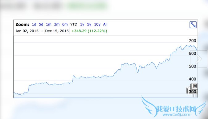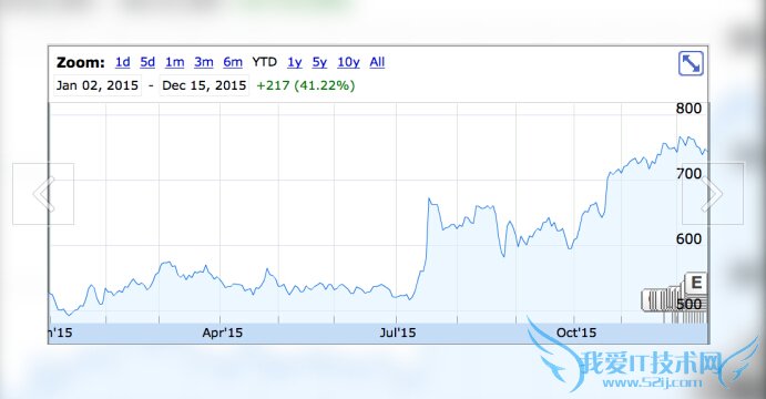 4、谷歌母公司Alphabet(NASDAQ: GOOG):谷歌母公司Alphabet今年的表现也是令人侧目。2015年该公司架构进行了重组,而且进一步展示了它们的无人驾驶汽车等产品。按今日股票收盘价约768美元计,该公司市值超过5210亿美元,而市值增幅超过40%。