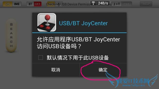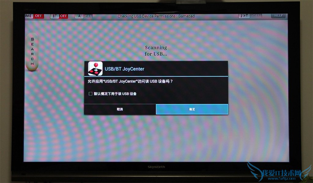 1、在乐视盒子上安装好这个程序后,击左侧的“搜索设备”,在弹出的提示框上点确定(注意不要勾选“默认情况下用于该USB设备”的复选框),之后应用就会识别出连接至手机的游戏手柄,如图: