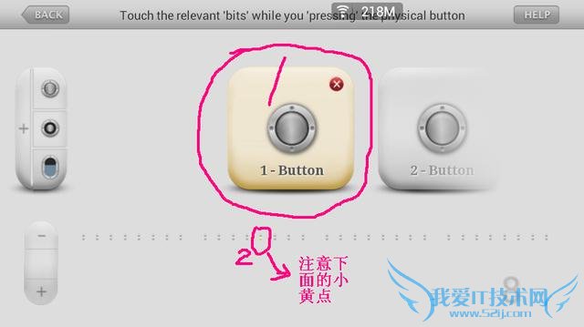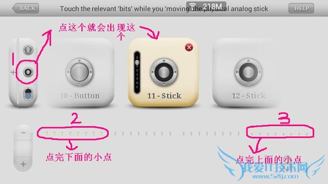 点击一下图中左上添加按键的按钮就会添加一个按钮,在屏幕中间会显示出来,这样你的手柄上有几个按键你就添加几个按钮。添加完按钮后,用鼠标点击第1个按钮,这时我们先按手柄上的1键,看下下面哪个点有反应,看到有反应的点之后,我们按住手柄上的1键,再鼠标点那个有反应的点(注意上下的小点分开来,不要点两个或两个以上),点了之后会有点微黄的感觉,这时松开手柄上的1键,这时我们刚刚点的那个小点就会变成黄色的小点,如图: