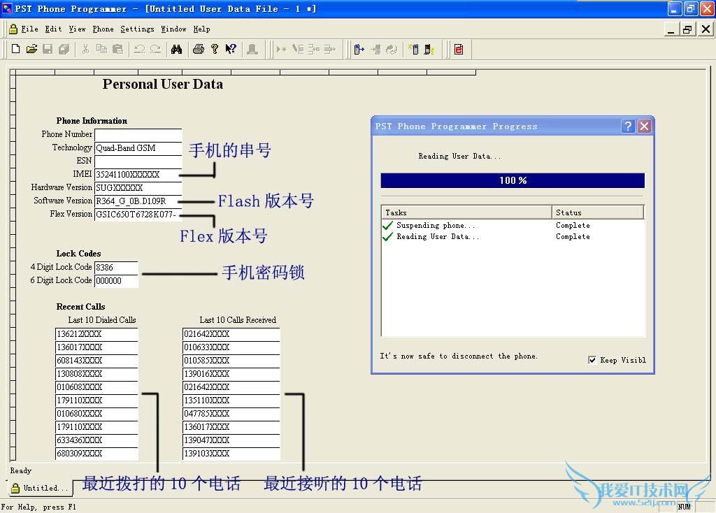 五、手机的信息就可以查看了。其中IMEI是手机的串号,Software Version是手机的Flash版本号,Flex Version是手机的Flex版本号,Lock Codes就是手机锁的密码了(朋友乐得直嘿嘿),Last 10 Dialed Calls是你最近拨出的10个手机号码,Last 10 Calls Received是你最近接听的10个手机号码。具体如下图: