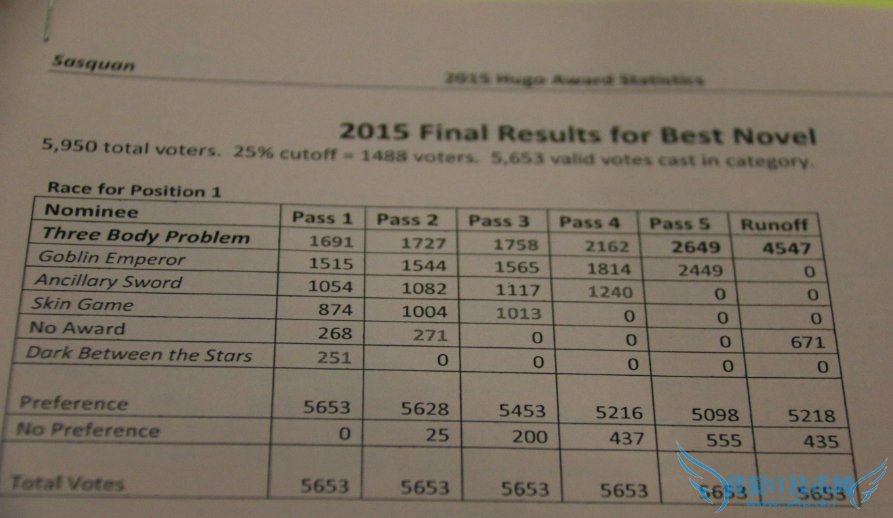 科幻大会官方公布了最佳长篇故事奖的投票数据,我们可以看到《三体》在五轮中一直处于首位,《哥布林皇帝》以150-200票的微弱劣势紧追不放。在最后一轮中,《三体》获得了2649票,最终拿下了雨果奖最佳长篇小说奖。