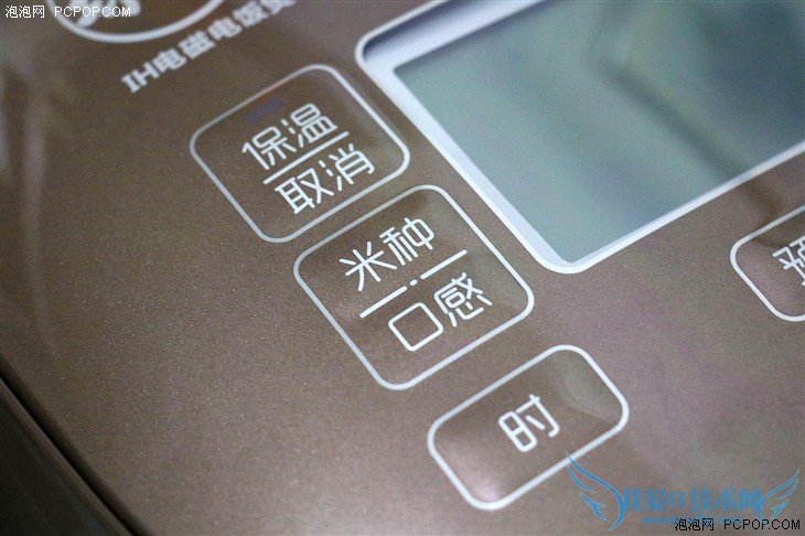 合上球釜IH电饭煲之后,我们在盖上可以看到中央有一块显示屏,显示屏周围是一圈按键,从左至右分别是保温、米种/口感、时间、预约/定时、开始和功能选择按键。