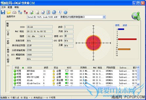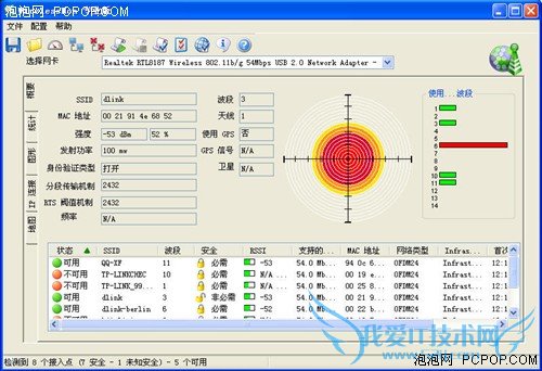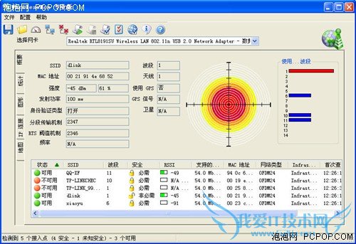 有三种无线网卡的信号强度对比,我们可以看出,蹭网卡的信号搜索能力要强于笔记本内置的Intel5100,但是和SAPIDO的外置无线网卡相比,还是有一定差距的。