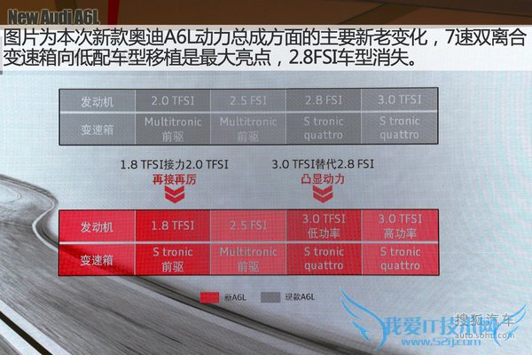 同时,在老款车型上只有从搭载2.8FSI发动机车型开始起步搭载的7速双离合变速箱也被并入了入门级产品的阵列。也就是说未来在奥迪A6L产品阵容当中只有搭载2.5FSI自然吸气发动机的车型才会独享CVT变速箱。