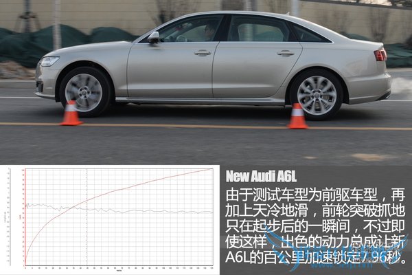 既然说到了这些我们来看一下换装新动力总成后的1.8TFSI+7速双离合版本车型在测试方面的表现。根据官方给出的数据,新车型的百公里加速时间较老款车型的8.7秒提高了0.2秒,达到8.5秒,那么通过我们的实际测试发现,官方的数据还是相对保守了一些,最终实测数据达到了7.96秒。