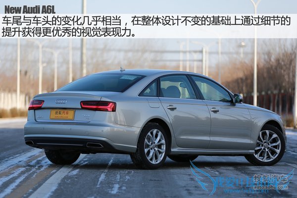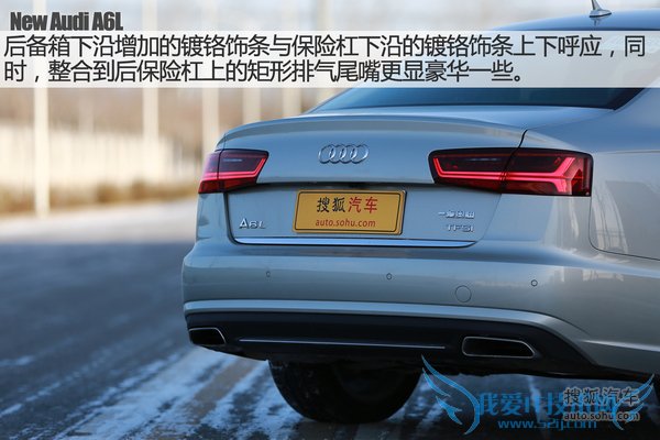 而在尾部方面细心的网友可以发现,新款A6L的全LED尾灯灯带与日间行车灯形成了前后呼应的架势,主体轮廓不变的基础上将尾灯的整体颜色调深,显得更有运动的气势。另外后备箱盖下沿一条镀铬装饰条与重新设计的后保险杠下方的镀铬饰条形成了一个呼应,同时排气尾嘴也由老款的圆形变为了目前的矩形。可以说整体在融入了更多运动气息之后也适当地提升了商务感。