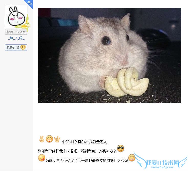于是有了“今天吃了仓鼠,感觉整个人都萌萌哒,萌萌哒”一说。但是这句话并非楼主所说,仅仅是围观者借用已有的梗狂欢而已。