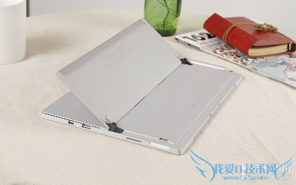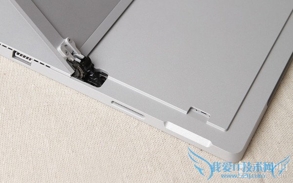 Surface Pro 4背部多角度一体式支架并未升级,最大可达150度左右、最小大约30度,基本涵盖用户日常使用所需要的角度。平板背面有两个凹槽,方便支架打开,黑色的铰链依旧是裸露的,处女座肯定接受不了。