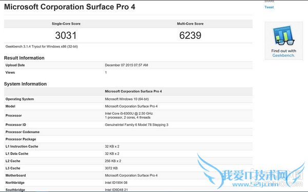 小编手中的微软Surface Pro 4搭载i5 6300U处理器,双核四线程,主频为2.4GHz,14纳米制程、额定功耗15W,内置Intel HD 520图形显示芯片。同时拥有8GB运行内存,256GB固态硬盘,性能测试软件Geekbench成绩为6239分,小编去年测试同档次的Surface Pro 3成绩为5290分。