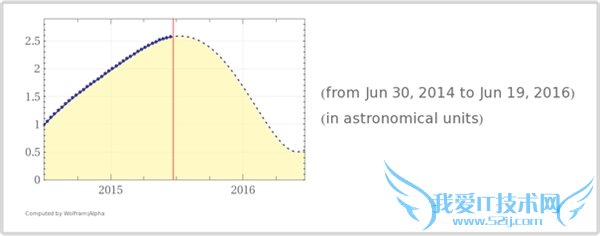 下面是从2014年6月30日到2016年6月19日之间,地球和火星之间的距离变化,横轴是时间,纵轴是距离,单位是AU,而光前进一个AU所需要的时间大约是8分钟。