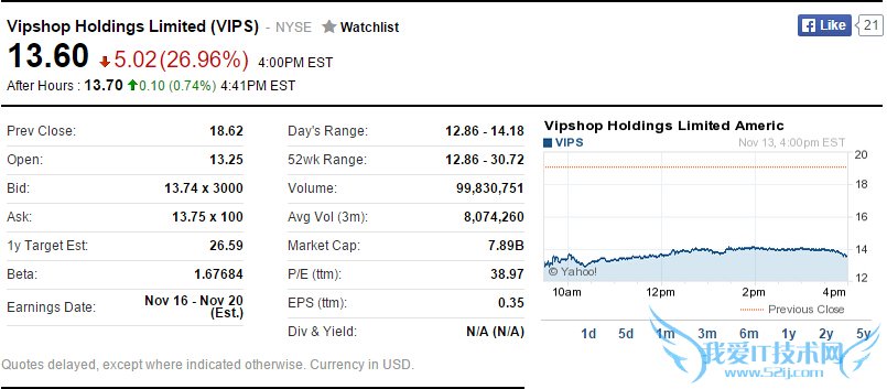 凤凰科技讯 北京时间11月14日消息,据国外投资网站Investors报道,电商公司唯品会周五发布第三季度业绩预警,降低了该公司此季度的营收预期,原因是今年天气相比往年较为暖和,导致消费者纷纷推迟购买价格更高的冬装。受此消息影响,唯品会股价周五收盘暴跌26.96%,收于13.60美元的52周新低。