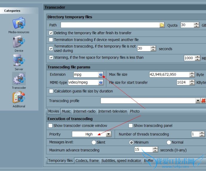 这一步很重要。前面说过了,对于电视机可以自己解码的影音文件,服务器就不再解码而直接发送给它,于是,这里的设置就是要告诉该软件,哪些影音格式是需要事先转码的,应该转成什么码。下图就是这个设置图,其中Transcoding file params里面的Extension(扩展名)这项,就是告诉软件要转成什么格式,点击这里的问号就可以在列表中选择,我这里选的是mpg格式。下面Execution of transcoding里面的Priority这项,是告诉软件在执行转码的时候的优先度,假如PC机的CPU速度足够快,这里不需要改动,如果机器速度不那么快,可以把这里设置为High,否则播放起来会卡。