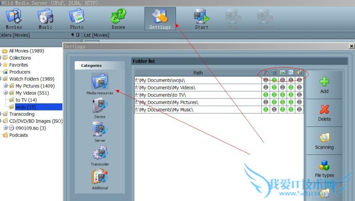 打开软件之后,先点上面的“Setting”,再点弹出菜单里面左边的“Media-resources”,这时,就可以设定你打算让客户端共享的文件目录了,右边有“Add”和“Delete”钮,如果要添加目录,就按“Add”,要删除目录就按“Delete”。当目录被添加到中间之后,按下图红圈所示的位置,选择目录的类型,从左到右依次是:音频、视频、照片、是否有子目录、是否每部影片单独用一个目录。