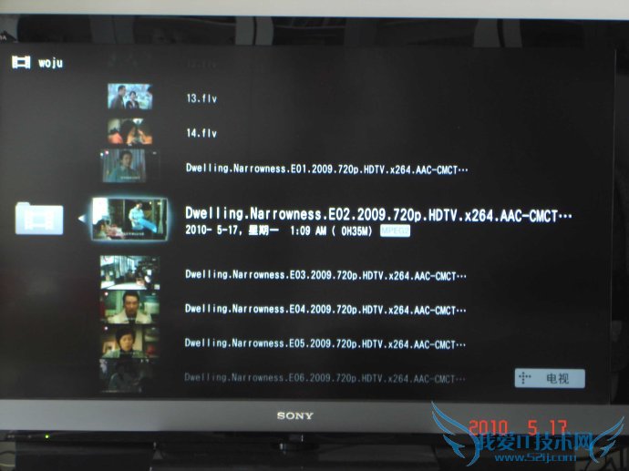 正如本文开头说的,靠到视频网站去抓取视频文件,很麻烦。我弟弟给我推荐了一个网站:VeryCD,打开一看,有很多视频资源,除了大陆外,还有台湾、韩国、日本和美国的影视节目,据他说有很多可看的东西以至于他现在都不看电视节目了。于是我去那里下载了电视剧《蜗居》的文件,这是mkv格式的文件,720P的高清格式,再用这个WMS来播放,效果很好。下图是在我电视机上的效果。