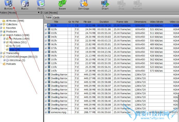 此外,有时候,某个视频文件可能播放不出来,或者有图像没有声音,这个软件提供了一个非常好的调试手段。先点屏幕左上角的“Movie”,再点左边的“Watch Folders”中相应的文件夹,这时屏幕右侧会显示该文件夹内各视频文件的详细情况,例如影片的时长、分辨率、码率等等,如下图。