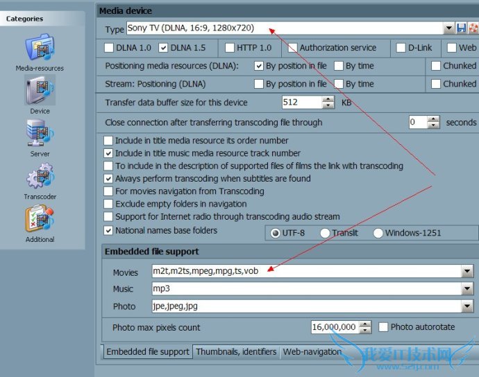 接下来点左边的“Device”,在弹出来的对话框中的上面Type一栏,在下拉式菜单中选择自己的设备,我选的是“SONY TV(DLNA, 16:9, 1280X720)”,(如果选1920X1080,支持的文件格式反倒少了,不知道是为什么。)下面的Embedded File Support栏目里面的文件格式,就是该电视机支持的格式,凡是这里面没有列出的格式,WMS软件都会进行转码处理。