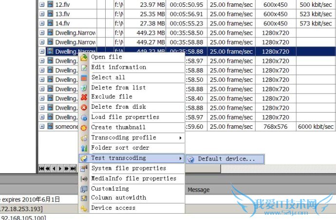 这时选择你想调试的视频文件,点右键会弹出一个菜单,选择其中的“test transcoding”及“default device”,这时该软件会对这个文件进行转码,并且会弹出一个DOS界面,里面有转码的过程和参数。如果有问题,在这里可以看到问题出在什么地方,而且转码后的视频文件存放在“C:\Documents and Settings\xxxxx\Local Settings\Application Data\Wild Media Server\WMS\Temp”目录下(这里的xxxxx是你在windows里的用户名),因此你也可以先在电脑这里播放一下看看有没有问题。