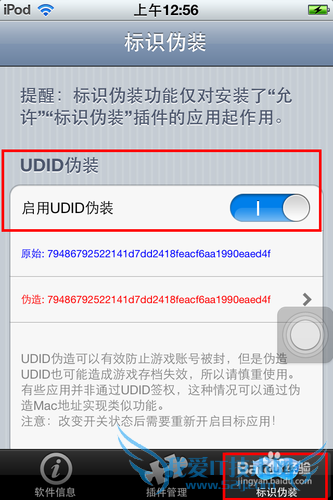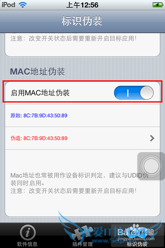 然后点击页面额最下方有个“标示伪装”。将“启用UUid伪装”和“启用mac地址伪装”两个功能的开关置为打开状态。这是为了让内购的时候不至于被苹果方面检测而封号。