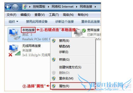 3:右键点击“本地连接”选择“属性”,如下图所示: