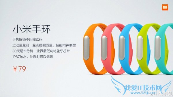 @小米手环售价79元,铝合金表面,激光微穿孔:1. 手机解锁不用输密码;2. 监测运动量、睡眠质量,智能闹钟震动唤醒;3.超长待机30天,是普通手环的5倍,业界最低功耗蓝牙芯片;4. 防水等级IP67,洗澡时无须摘下。