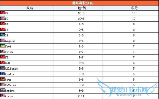 VG战队作为中国军团的领头狼,形势一片大好,以13战10胜3负的好成绩与EG战队并列榜首。中国军团双子星IG战队与DK战队稳扎稳打,以14战9胜5负的成绩并列第三名。而积分榜榜尾的是来自东南亚的Arrow战队,以13战2胜11负的成绩率先出局,希望Arrow调整好心态,以观众的角色好好享受这届DOTA2世界杯吧,Ti5还是一条好汉。