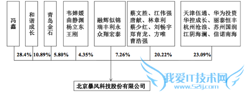 截至2015年1月31日,暴风科技股权结构见下图。其中,冯鑫、韦婵媛、曲静渊、王刚为公司董事及高管;融辉似锦及往后的瑞丰利永、众翔宏泰都是员工持股的合伙企业,冯鑫是三家公司唯一的执行事务合伙人;蔡文胜等人为公司外部自然人股东。华为投资、天津伍通等均为机构投资者。